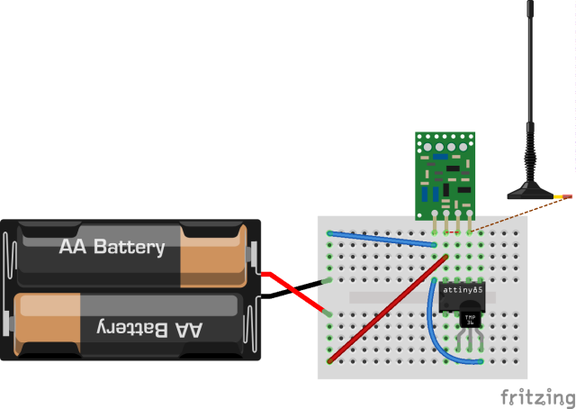 It uses a TMP36 to read temperature and it is optimised for power consumption.